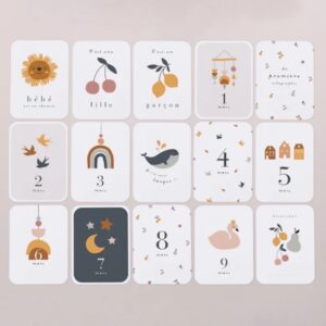 Ses illustrations douces et modernes, aux teintes tendances, sublimeront vos photos mois après mois : l’annonce de la grossesse, la première échographie, les premiers mouvements du bébé, ou encore l’évolution de votre ventre rond.