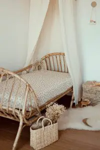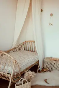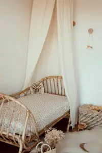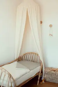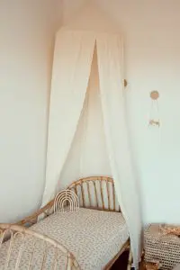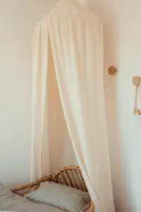 Structure cerceau en acier à insérer dans la coulisse du tissu en la faisant glisser délicatement. Le ciel de lit s’accroche au plafond à l’aide d’un lien en coton à nouer.