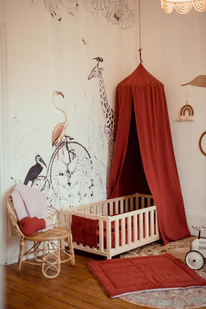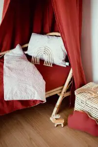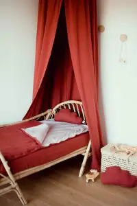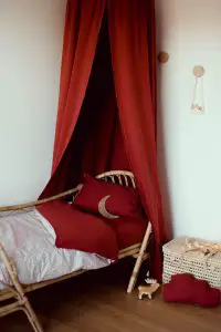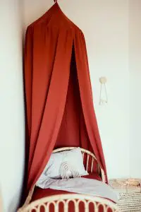 Structure cerceau en acier à insérer dans la coulisse du tissu en la faisant glisser délicatement. Le ciel de lit s’accroche au plafond à l’aide d’un lien en coton à nouer.