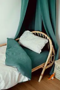 Structure cerceau en acier à insérer dans la coulisse du tissu en la faisant glisser délicatement. Le ciel de lit s’accroche au plafond à l’aide d’un lien en coton à nouer.