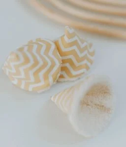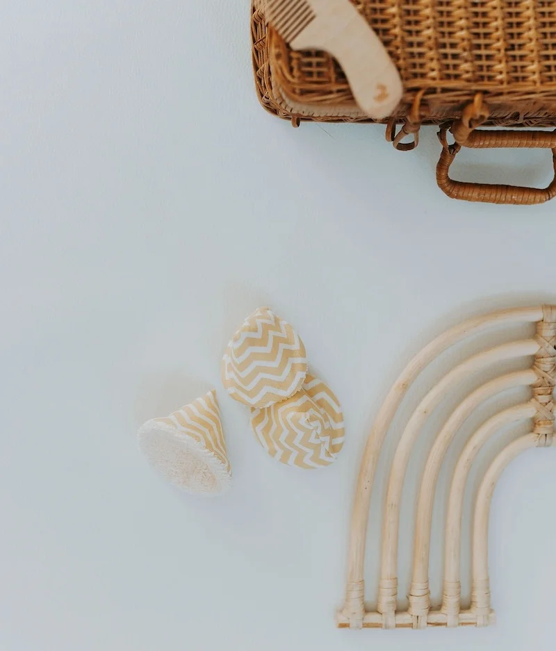 • Coton à motifs chevrons jaunes et éponge écrue super absorbante certifiés sans substance nocive ou irritante.
