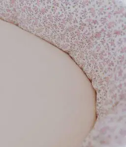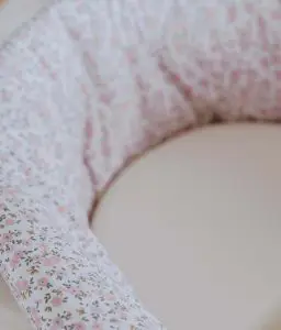 • l’habillage du couffin en coton fleuri lilas garni de ouate hypoallergénique