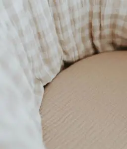 • l’habillage du couffin en double gaze de coton vichy galet garni de ouate hypoallergénique