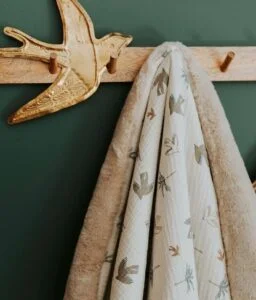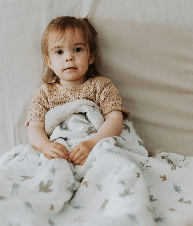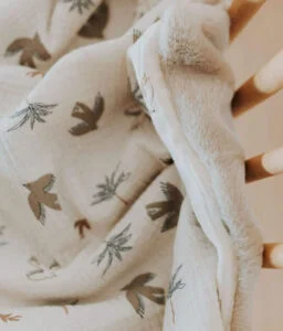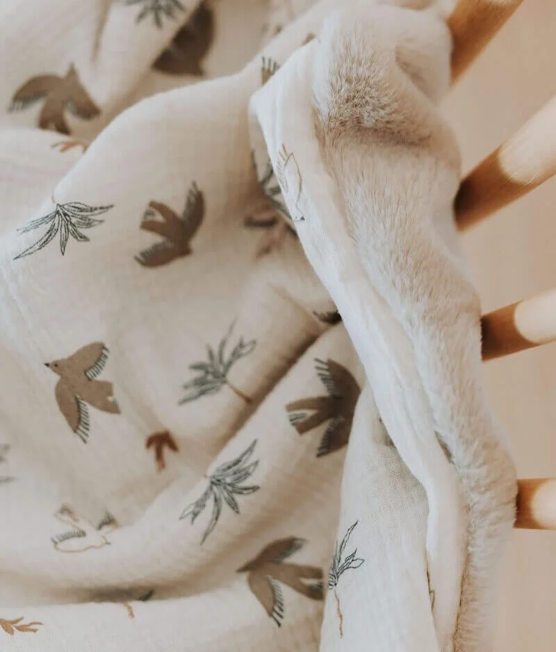 • Polaire incroyablement douce et moelleuse effet « ourson en peluche » et double gaze de coton écru à motifs oiseaux certifiés sans substance nocive ou irritante.