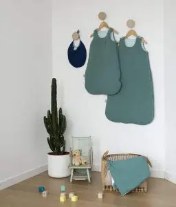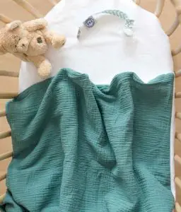 • Double gaze de coton vert-eucalyptus certifié sans substance nocive ou irritante.