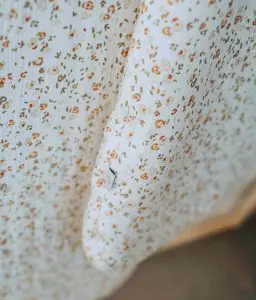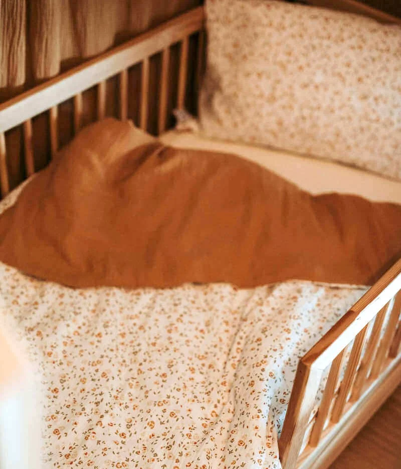 • Extérieur en double gaze blanc à motifs tachetés camel et kaki et intérieur en double gaze de coton camel certifiées sans substance nocive et ouate hypoallergénique.