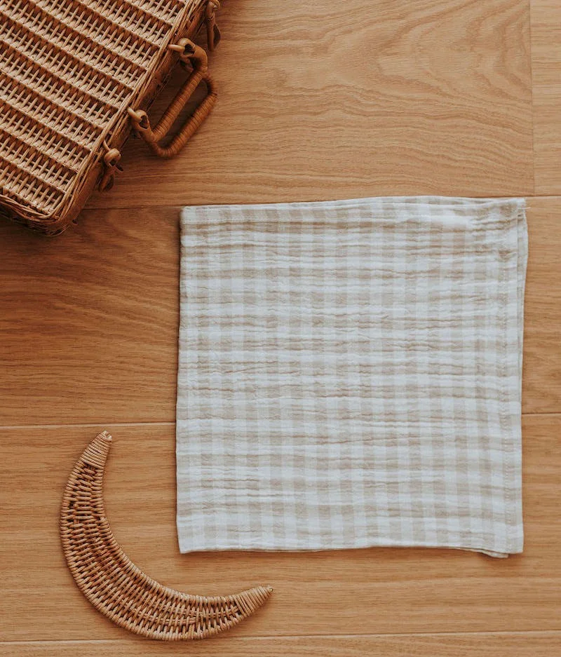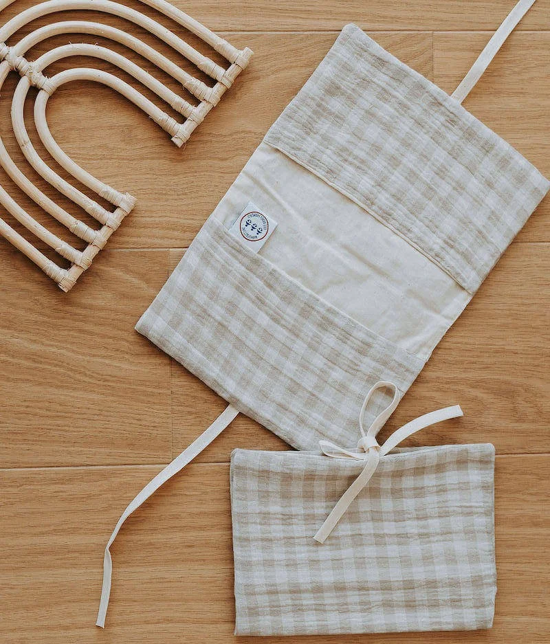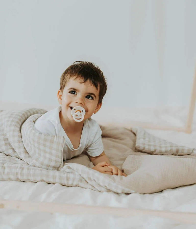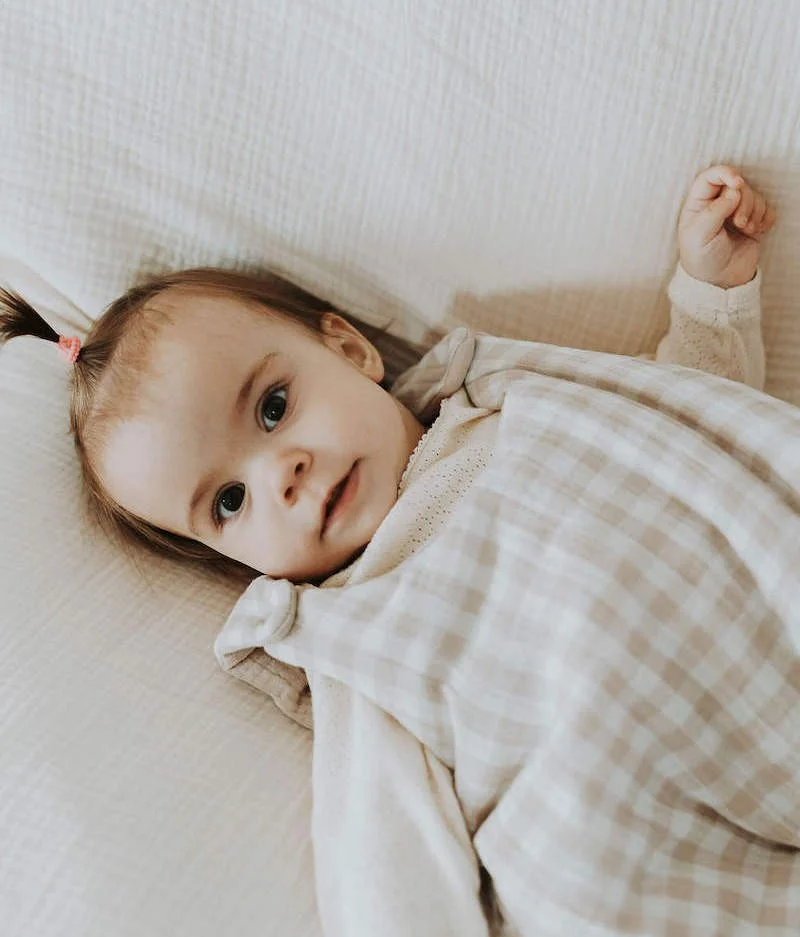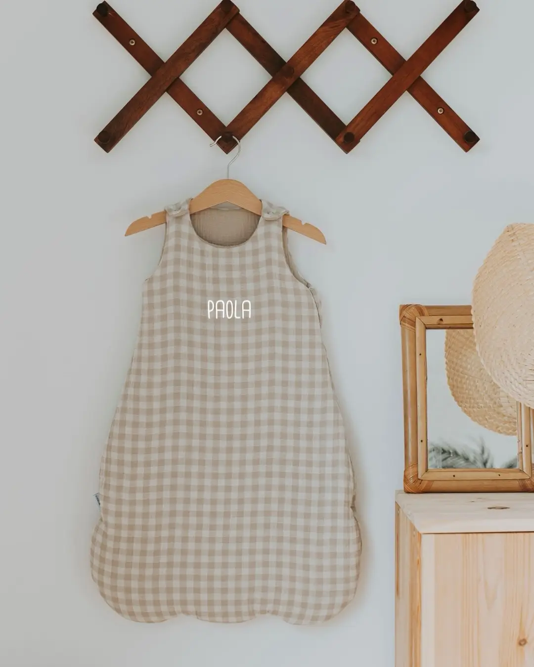 • Extérieur en double gaze de coton vichy galet et intérieur en double gaze de coton uni couleur galet certifiées sans substance nocive et ouate hypoallergénique.