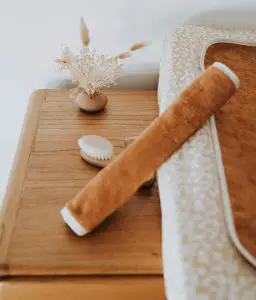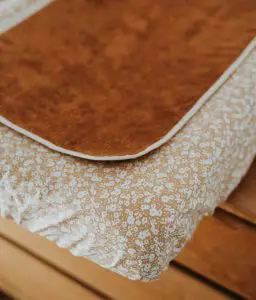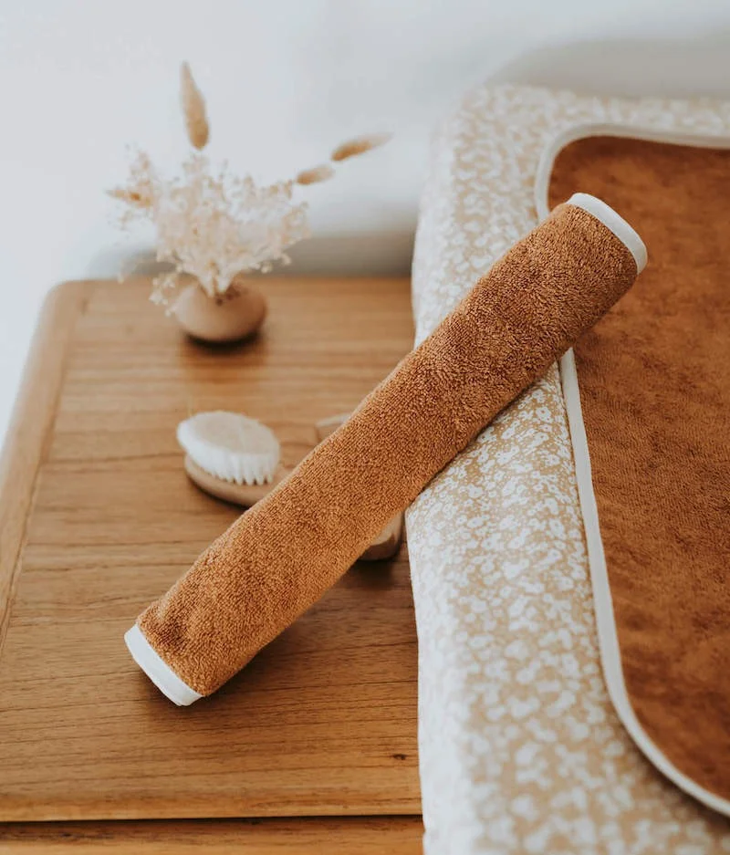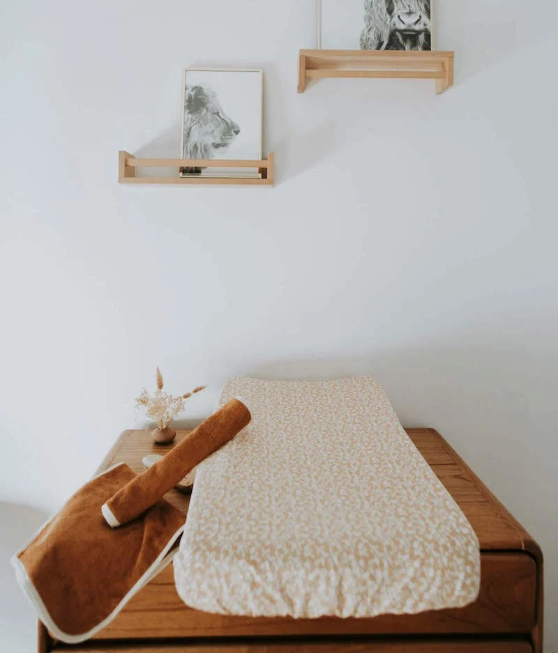 Habillez le matelas à langer de bébé avec notre housse en coton fleuri caramel. Elle s’enfile très facilement comme un drap housse. Ses petites serviettes amovibles camel offrent une protection parfaite afin de ne pas devoir changer la housse du matelas à chaque petite fuite.