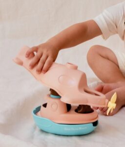 À l’intérieur se cache un petit bateau détachable, parfait pour le bain ou les jeux d’eau.