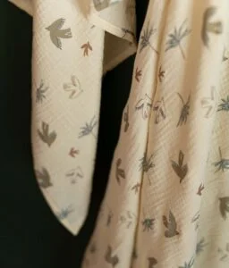 • Double gaze de coton écru à motifs oiseaux certifiée sans substance nocive ou irritante.