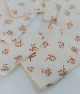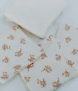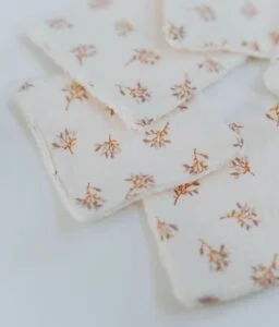 • Composées d’un côté d’éponge écru super absorbante 100% coton, et de l’autre côté d’une double gaze écru à motifs fleuris roses