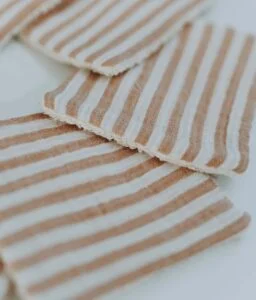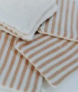 • Composées d’un côté d’éponge écru super absorbante 100% coton, et de l’autre côté d’une double gaze à rayures caramel.