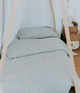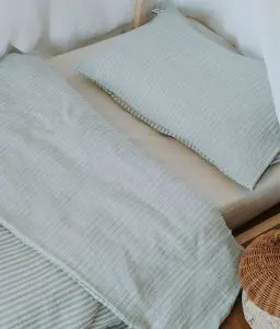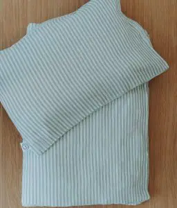 • Taie d’oreiller 40×60 cm et Housse de couette 100×140 cm forme « cheminée »  qui permet de maintenir la couette en place grâce au rabat coincé sous le matelas