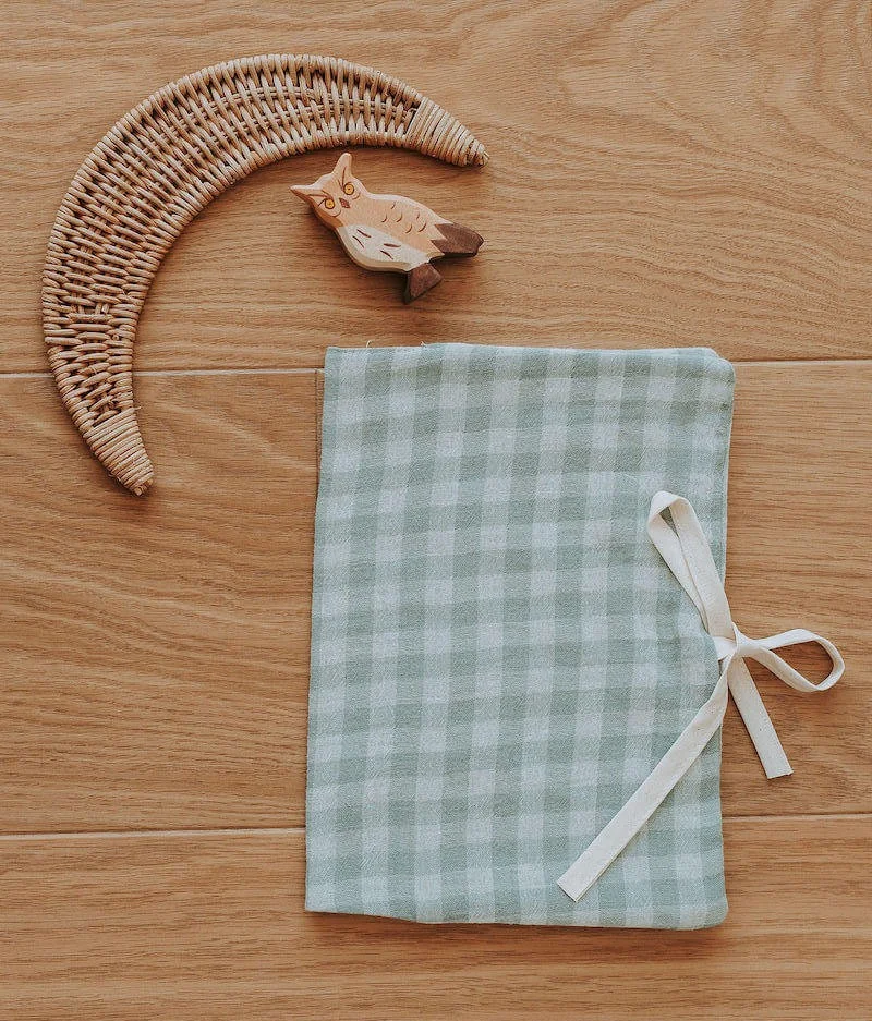• Double gaze de coton vichy vert de gris avec un biais ivoire à nouer certifiés sans substance nocive ou irritante.