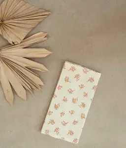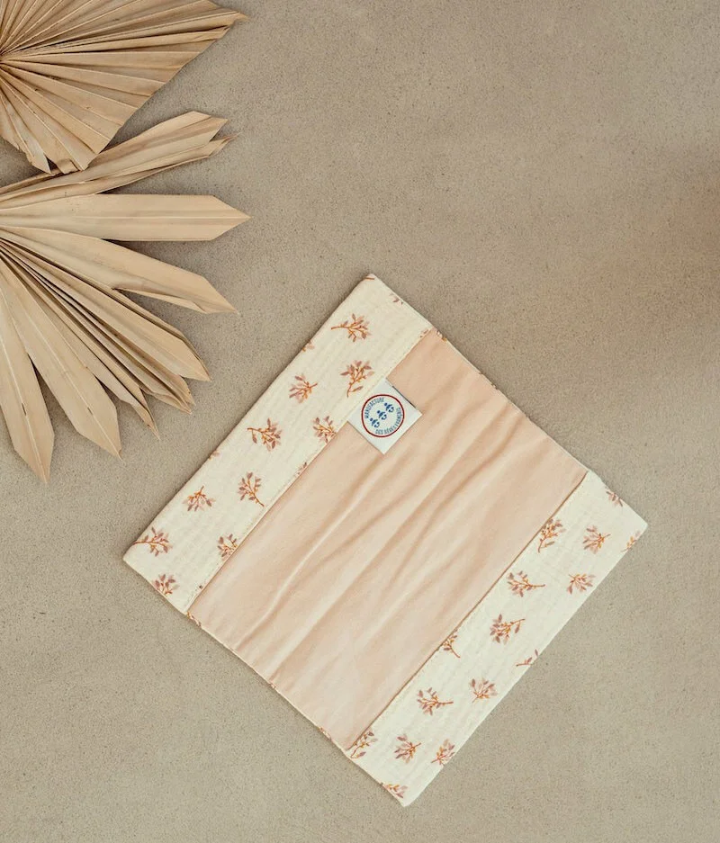 • Extérieur en double gaze de coton écru à motifs fleuris et intérieur en coton rose nude certifiés sans substance nocive