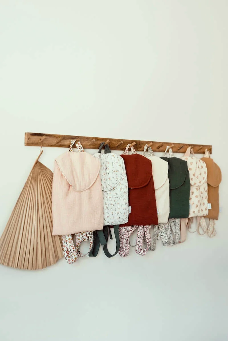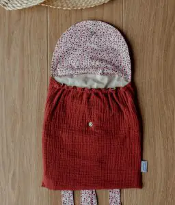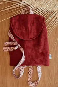 Notre sac à dos en double gaze de coton est personnalisable avec le prénom de bébé ou avec un petit mot d’amour de votre choix.
