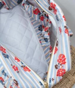 • En toile de coton épaisse Vintage flowers à rayures bleu et fleurs rouge ultra résistante et certifiée sans substance nocive.