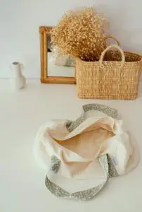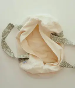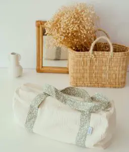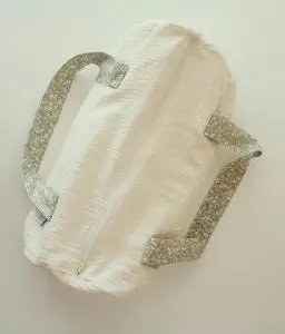 • Composé à l’extérieur de double gaze de coton écru et de 2 anses porté épaule en coton vert à motifs fleuris ainsi que d’une grande ouverture zippée