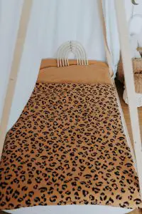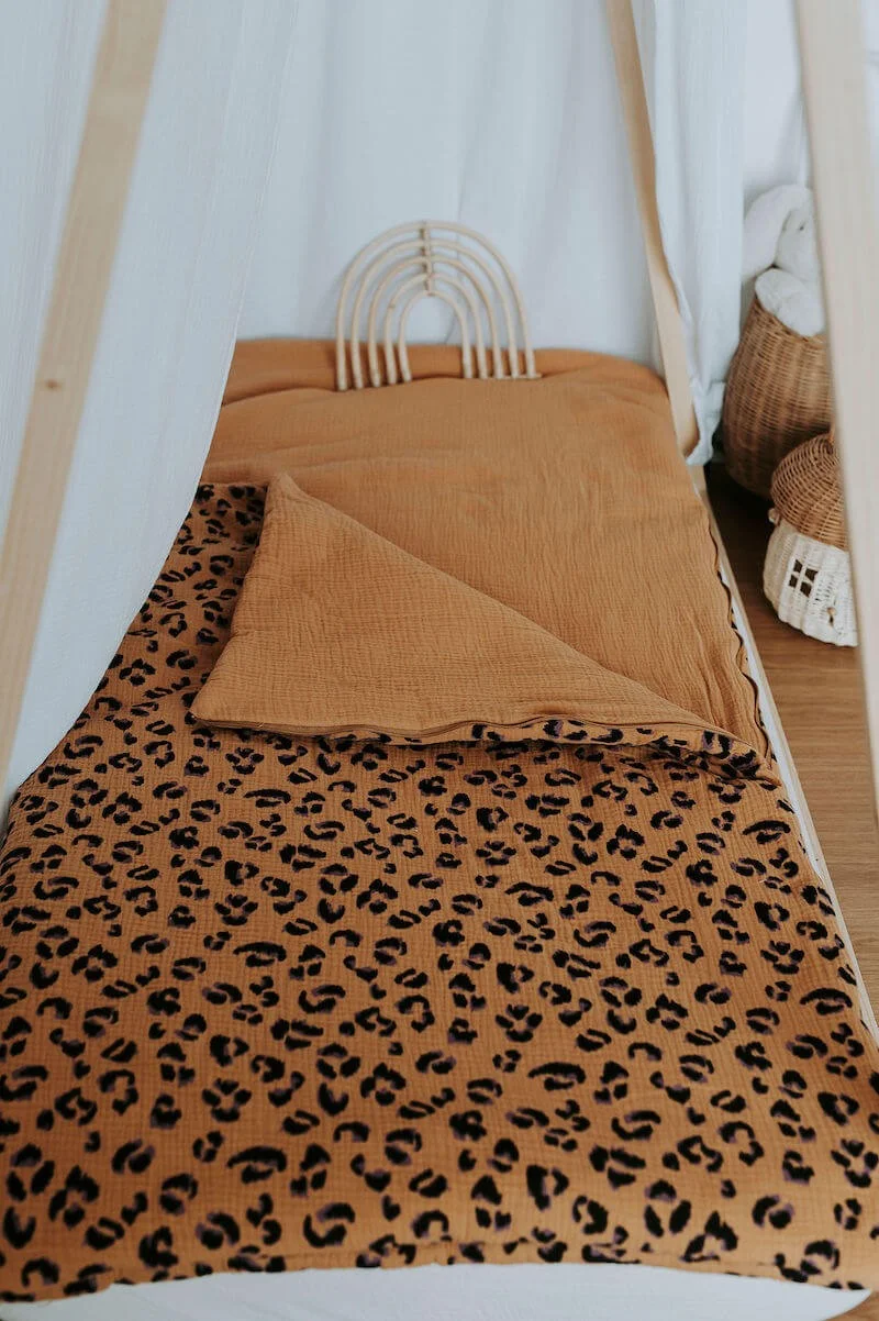 • Extérieur en double gaze de coton camel à motifs léopard noir et violet et intérieur en double gaze de coton uni camel certifiés sans substance nocive.