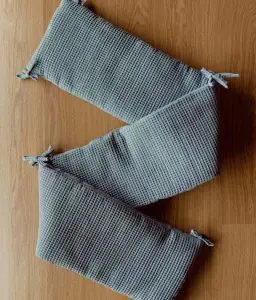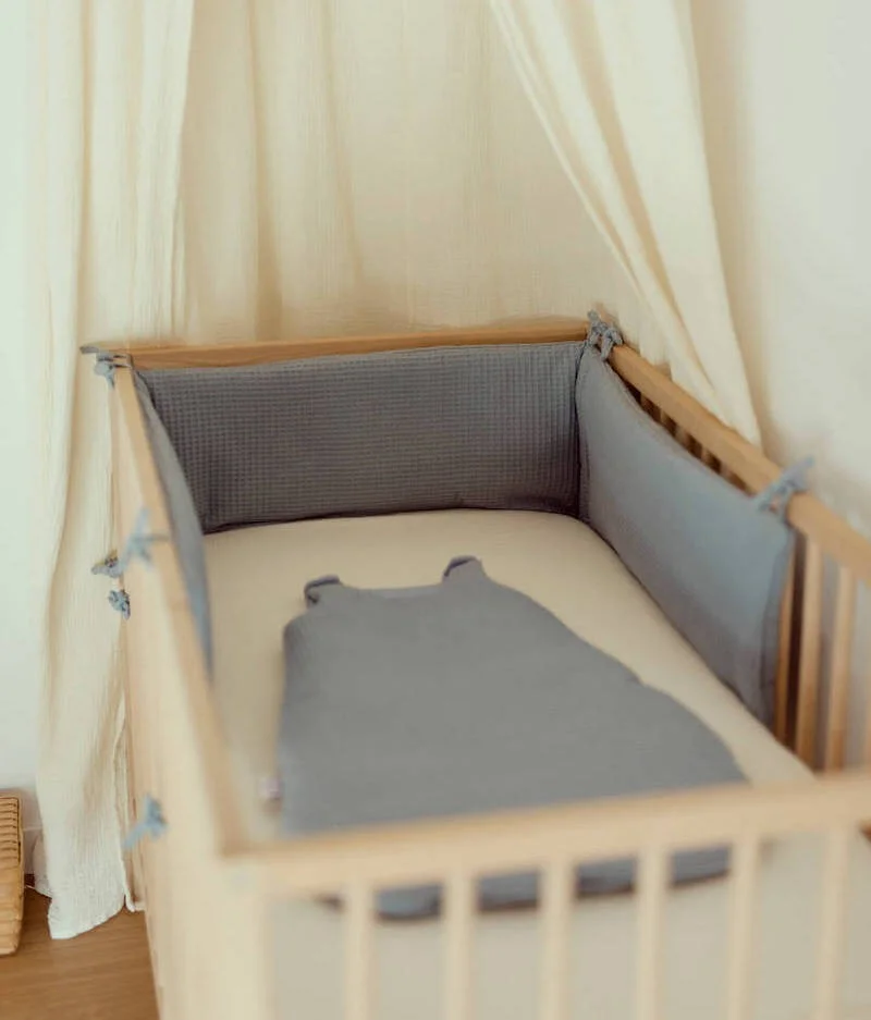 Notre tour de lit est composé de nid d’abeille 100% coton. Ce tour de lit est également garni de ouate hypoallergénique au matelassage douillet.