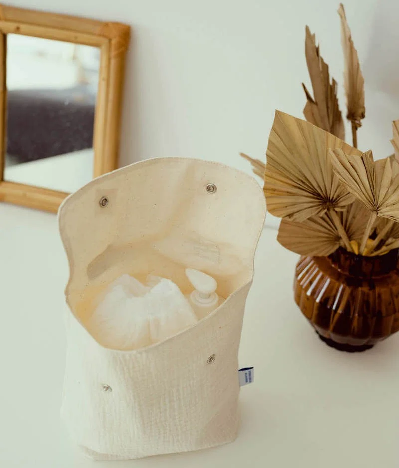 Notre trousse de toilette est personnalisable avec le prénom de bébé ou avec un petit mot d’amour de votre choix.