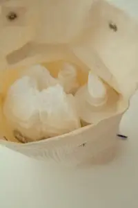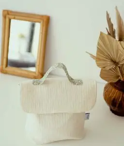 Upcycling : Notre trousse de toilette est fabriquée avec nos chutes de tissus et elle personnalisable avec le prénom de bébé